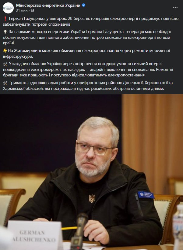 Міністр енергетики Герман Галущенко заявив про обмеження електропостачання через ремонтні роботи на Житомирщині.