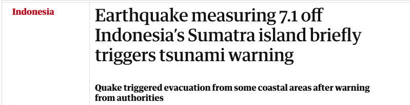 В Індонезії біля острова Суматра стався землетрус магнітудою 7,3 балів. Населення попередили про можливе цунамі.
