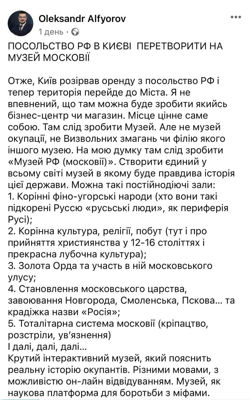 Голова топонімічної комісії Києва, історик Олександр Алфьоров, запропонував перетворити посольство РФ, з яким київська влада розірвала договір про оренду, на "музей Московії".