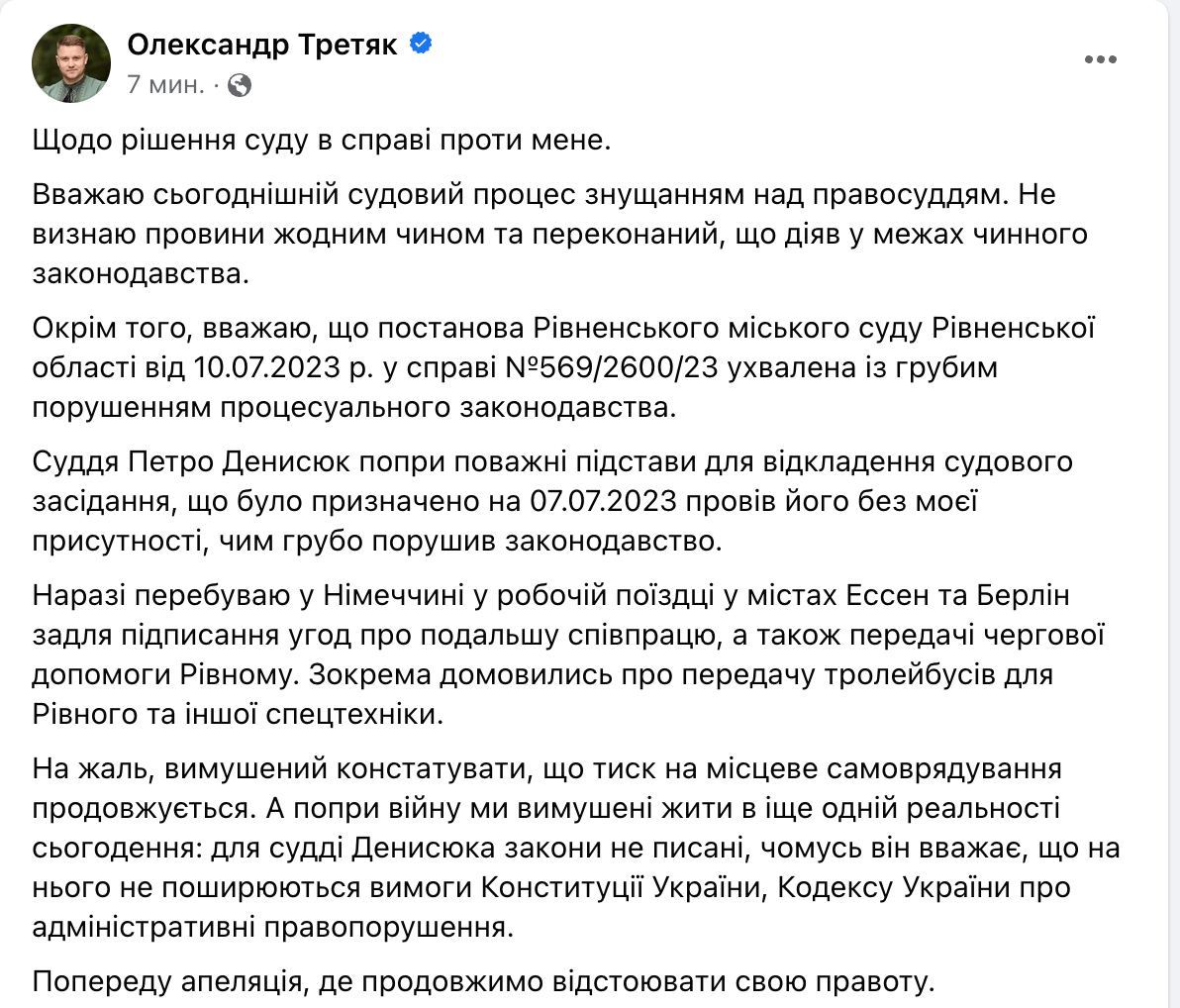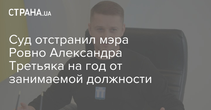 Суд усунув ще одного українського мера з посади. Мера Рівного Олександра Третьяка (представляє "Євросолідарність") оштрафували на 6800 грн і усунули на рік з посади, визнавши винним у справі про корупцію.