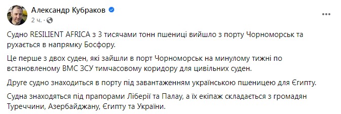 В Україні судно Resilent Africa завантажило 3 тисячі тонн пшениці та вирушило у напрямку Босфору.