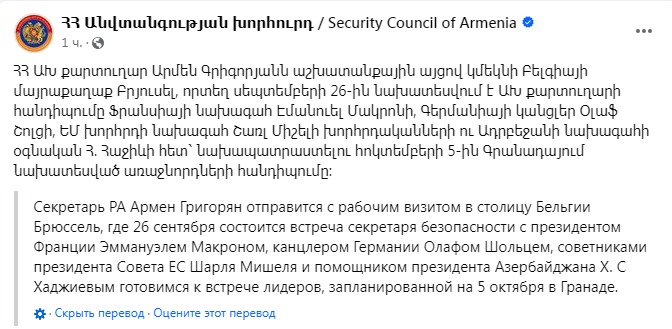 Також представники глав держав спершу вирушать до Брюсселя, щоб обговорити порядок денний переговорів. Передбачено п'ятисторонню зустріч за участю прем'єр-міністра Вірменії Нікола Пашиняна, президента Азербайджану Ільхама Алієва, президента Франції Емманюеля Макрона, канцлера Німеччини Олафа Шольца та голови Євроради Шарля Мішеля.