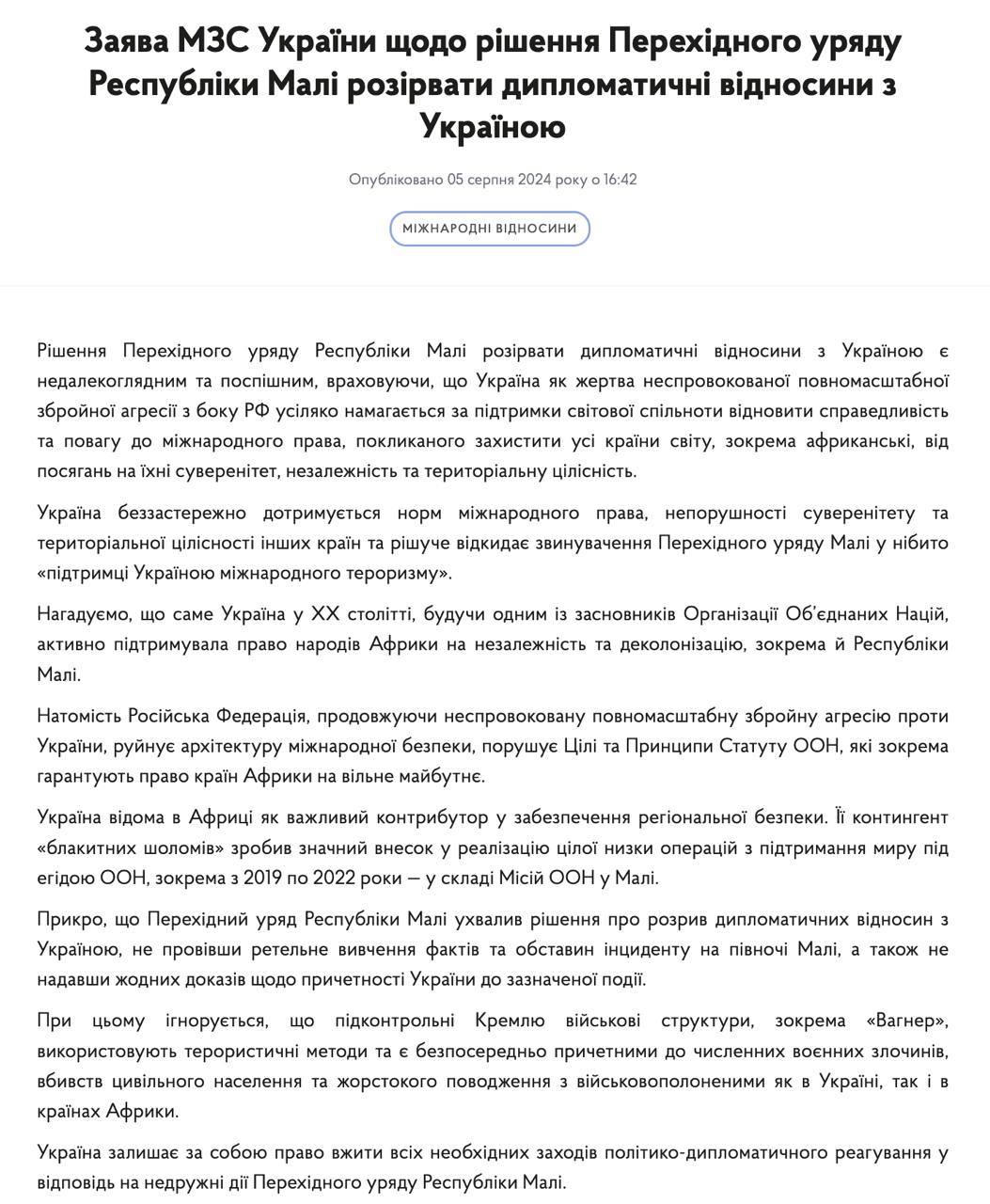 "Прикро, що перехідний уряд Республіки Малі ухвалив рішення про розрив дипломатичних відносин з Україною, не провівши ретельного вивчення фактів та обставин інциденту на півночі Малі, а також не надавши жодних доказів причетності України до цієї події", - заявили в МЗС України.