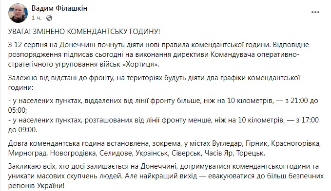 У Донецькій області з 12 серпня запроваджують новий режим комендантської години. Розклад
