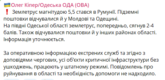 У свою чергу, голова Одеської обласної військової адміністрації Олег Кіпер у своєму телеграм-каналі повідомив, що на півдні Одеської області землетрус, попередньо, досяг 2-4 балів. Також відчувалися поштовхи та інших районах області.