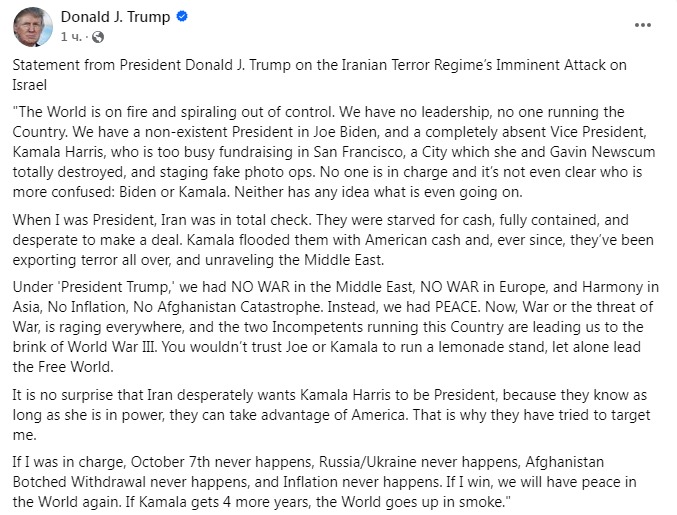Кандидат у президенти США від Республіканської партії Дональд Трамп назвав ракетну атаку Ірану на Ізраїль війною, а влада в Тегерані - терористичним режимом.