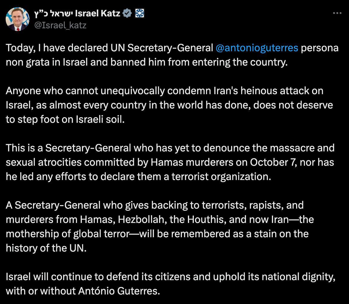 "Будь-який, хто не може однозначно засудити поганий напад Ірану на Ізраїль, як це зробили майже всі країни світу, не заслуговує на те, щоб ступити на ізраїльську землю. Це Генеральний секретар, який ще не засудив різанину і сексуальні звірства, вчинені вбивцями ХАМАС 7 жовтня, і не очолив жодних зусиль щодо оголошення їхньою терористичною організацією", - заявив Ісраель Кац.