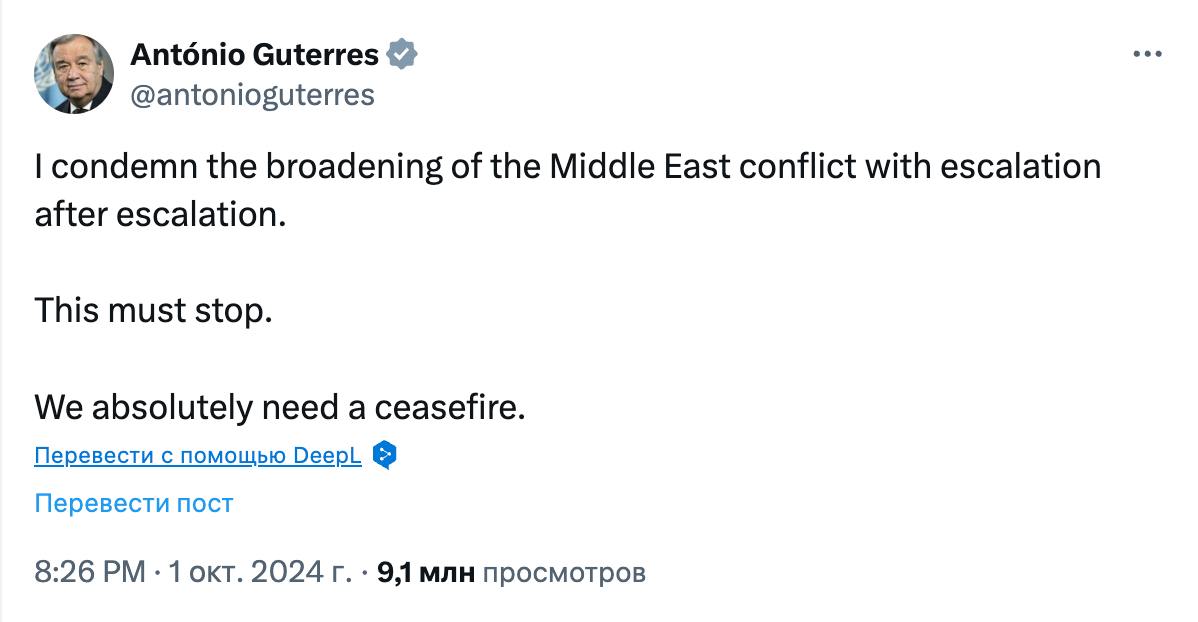 "Я засуджую розширення близькосхідного конфлікту з ескалацією за ескалацією. Це має припинитися. Нам абсолютно необхідне припинення вогню", - написав генсек ООН у Х.