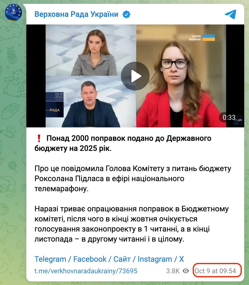 У каналі Ради продовжують регулярно виходити публікації із частотою приблизно одна на годину. За сьогодні на момент публікації новини там з'явилося вісім оригінальних постів та один репост публікації Володимира Зеленського.
