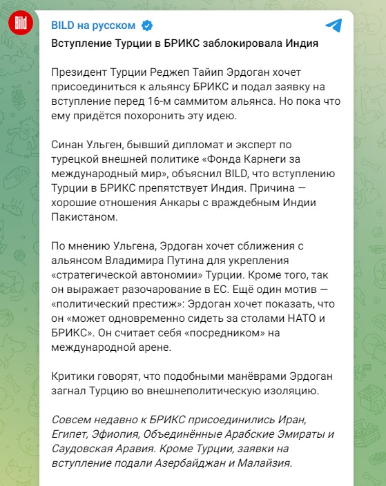 На його думку, турецький президент Реджеп Тайіп Ердоган розчарований у ЄС, тому хоче зближення з альянсом Володимира Путіна та Сі Цзіньпіна для зміцнення "стратегічної автономії" Туреччини і щоб показати, що він "може одночасно сидіти за столами НАТО та БРІКС", оскільки вважає себе "посередником" на міжнародній арені.