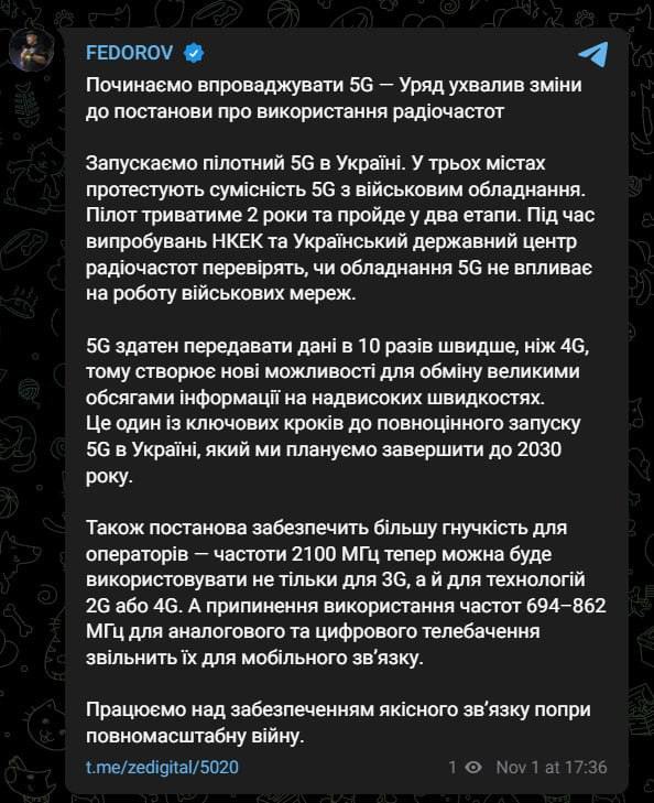 "Ми повинні розвивати інновації та наздоганяти світ, навіть незважаючи на повномасштабну війну. Дякую нашим партнерам - компанії Vodafone і Nokia - за важливий крок до впровадження 5G. Сподіваюся, дуже скоро зможемо масштабувати технологію", - говорив тоді глава Мінцифри