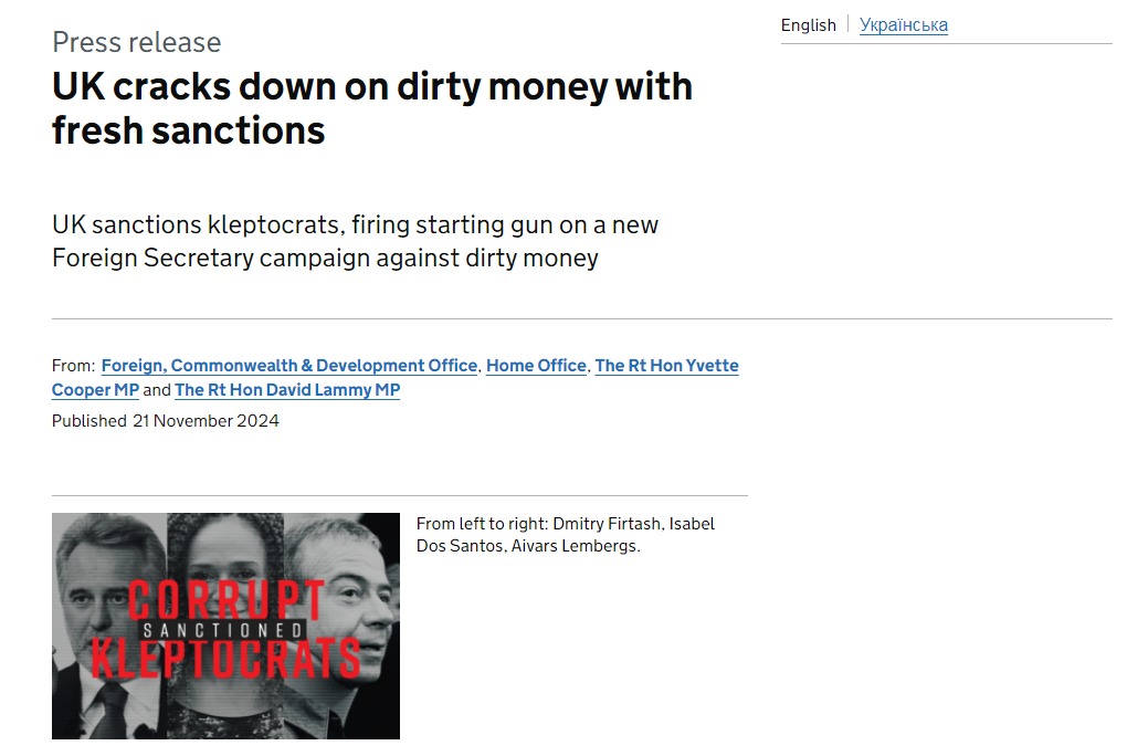 "Дмитро Фірташ - сумнозвісний олігарх, який вивів сотні мільйонів фунтів з України, отриманих завдяки корупційним схемам і контролю над розподілом газу. Тільки на ринку нерухомості Великої Британії він приховав десятки мільйонів фунтів, отриманих нечесним шляхом. Сполучене Королівство також застосувало санкції до його дружини Лади Фірташ, яка отримала вигоду від його корупційної діяльності та на яку записано його британські активи, зокрема будівлю старої станції метро "Бромптон-роуд", та Дениса Горбуненка, британського фінансового "посередника", який сприяв корупції Фірташа", - сказано в прес-релізі.