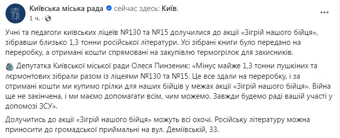 "Учні та педагоги київських ліцеїв №130 та №15 приєдналися до акції "Зігрій нашого бійця", зібравши близько 1,3 тонни російської літератури. Усі зібрані книги були передані на переробку, а отримані кошти спрямовані на закупівлю термогрілок для захисників", - сказано у публікації.