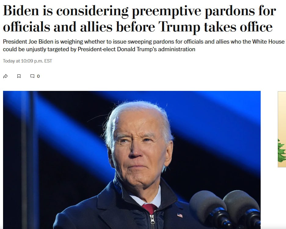 За словами джерел The Washington Post, Байден ще не ухвалив рішення про "превентивні помилування", але в адміністрації працюють над тим, щоб бути готовими на випадок його згоди.