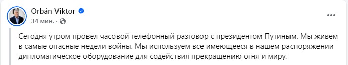 "Сьогодні вранці провів годинну телефонну розмову з президентом Путіним. Ми живемо в найнебезпечніші тижні війни. Ми використовуємо всі дипломатичні засоби, які є в нашому розпорядженні, для сприяння припиненню вогню і досягненню миру", - написав Орбан.