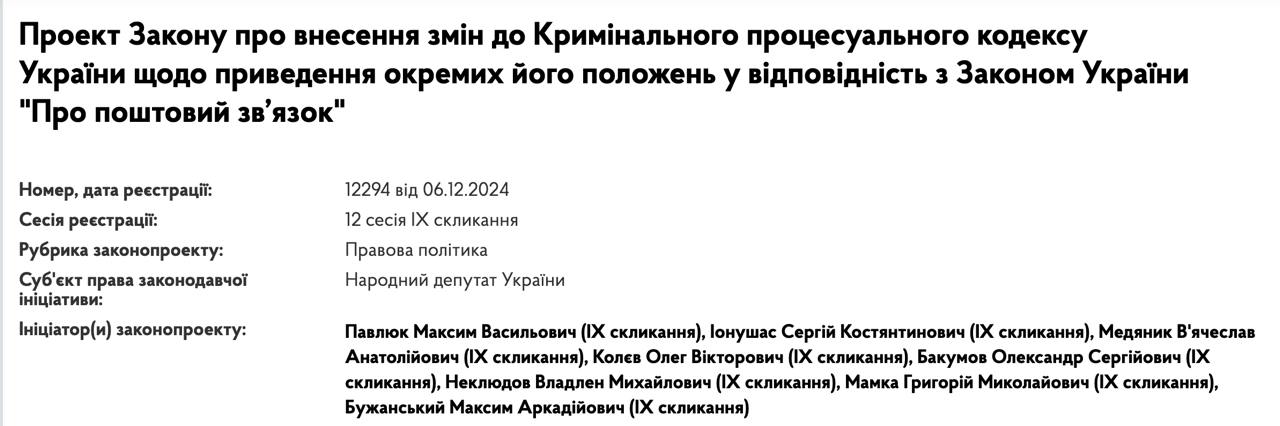 Картку проекту закону під назвою "Про внесення змін до Кримінального процесуального кодексу України про приведення окремих його положень у відповідність до закону України "Про поштовий зв'язок" опубліковано на сайті парламенту.