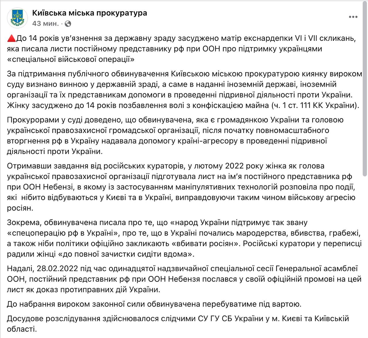 "Отримавши завдання від російських кураторів, у лютому 2022 року жінка як голова української правозахисної організації підготувала листа на ім'я постійного представника РФ при ООН Небензі, в якому із застосуванням маніпулятивних технологій розповіла про події, які нібито відбуваються в Києві та Україні, виправдовуючи таким чином військову агресію росіян. Зокрема, обвинувачена писала про те, що "народ України підтримує так звану "спецоперацію Росії в Україні", про те, що в Україні почалися мародерства, вбивства, грабежі, а також ніби політики офіційно закликають "вбивати росіян". Російські куратори у листуванні радили жінці "до повної зачистки сидіти вдома", - заявляє прокуратура.
