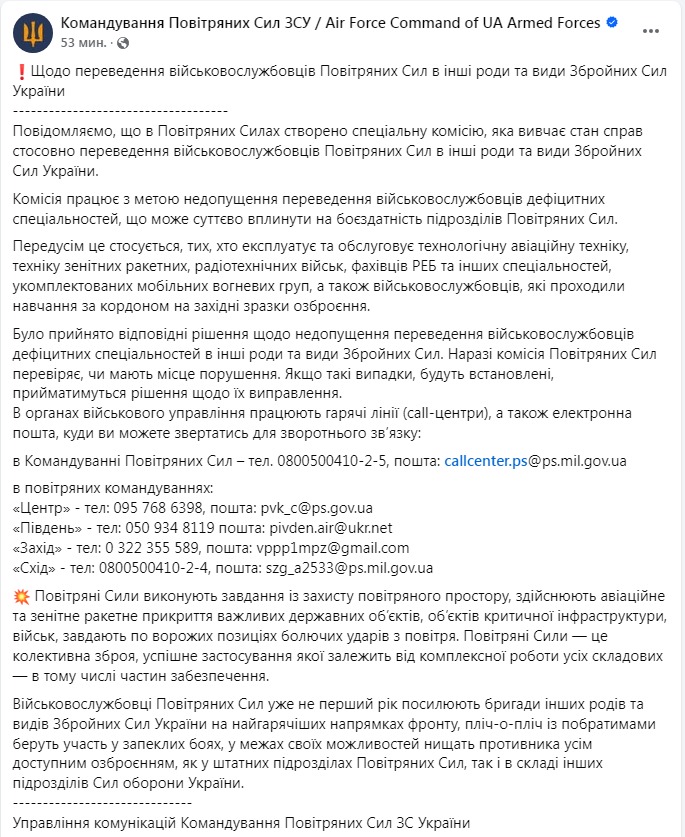 "Повідомляємо, що в Повітряних силах створено спеціальну комісію, яка вивчає стан справ стосовно переведення військовослужбовців Повітряних сил в інші роди та види Збройних сил України. Комісія працює з метою недопущення переведення військовослужбовців дефіцитних спеціальностей, що може суттєво вплинути на боєздатність підрозділів Повітряних сил. Передусім це стосується, тих, хто експлуатує та обслуговує технологічну авіаційну техніку, техніку зенітних ракетних, радіотехнічних військ, фахівців РЕБ та інших спеціальностей, укомплектованих мобільних вогневих груп, а також військовослужбовців, які проходили навчання за кордоном на західні зразки озброєння. Було прийнято відповідні рішення щодо недопущення переведення військовослужбовців дефіцитних спеціальностей в інші роди та види Збройних сил", - сказано у публікації.