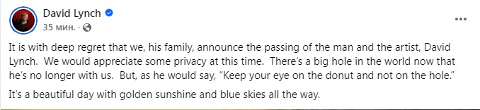 "З глибоким жалем ми, його родина, повідомляємо про смерть людини і художника Девіда Лінча. Ми були б вдячні за невелику усамітнення в цей час. Тепер, коли його більше немає з нами, у світі утворилася велика дірка. Але, як він сказав би : "Стежте за пончиком, а не за діркою", - сказано в публікації