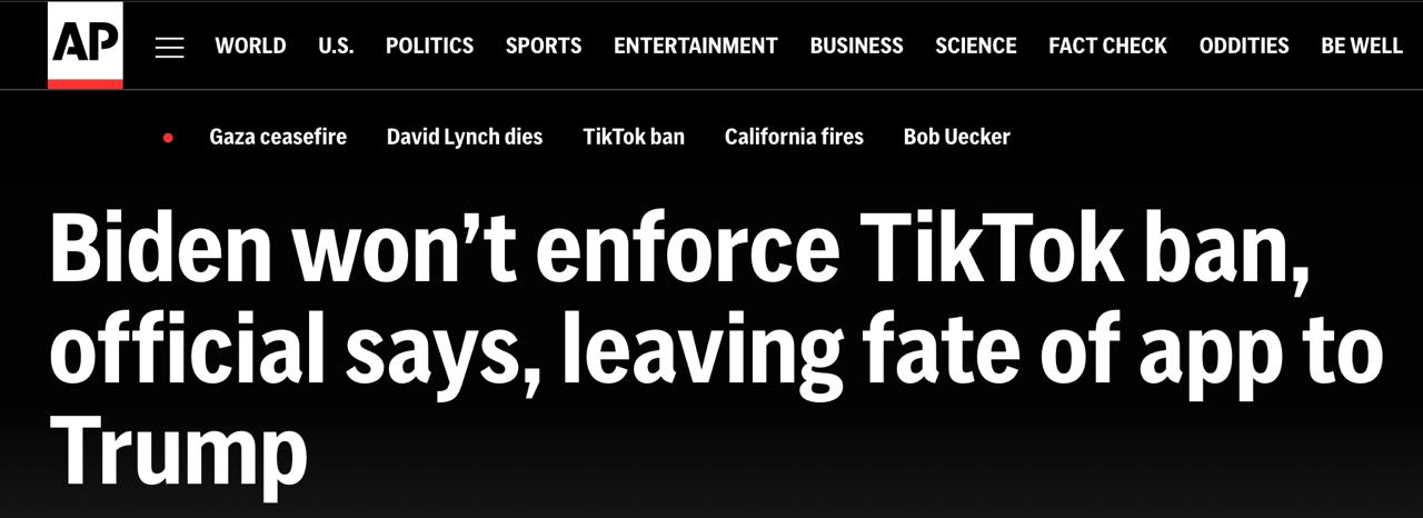 Торік Конгрес у законі, підписаному Байденом, зажадав, щоб материнська компанія TikTok у Китаї ByteDance продала компанію до 19 січня – за день до інавгурації президента. Адміністрація, що йде, залишить реалізацію цього закону республіканцям.