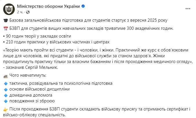 "Теорію мають пройти всі студенти – і чоловіки, і жінки. Практичний курс обов'язковий тільки для чоловіків, які придатні до військової служби за станом здоров'я. Жінки проходитимуть практику тільки за власним бажанням і після проходження медичного огляду", – розповів заступник міністра оборони. бригадний генерал юстиції Сергій Мельник.