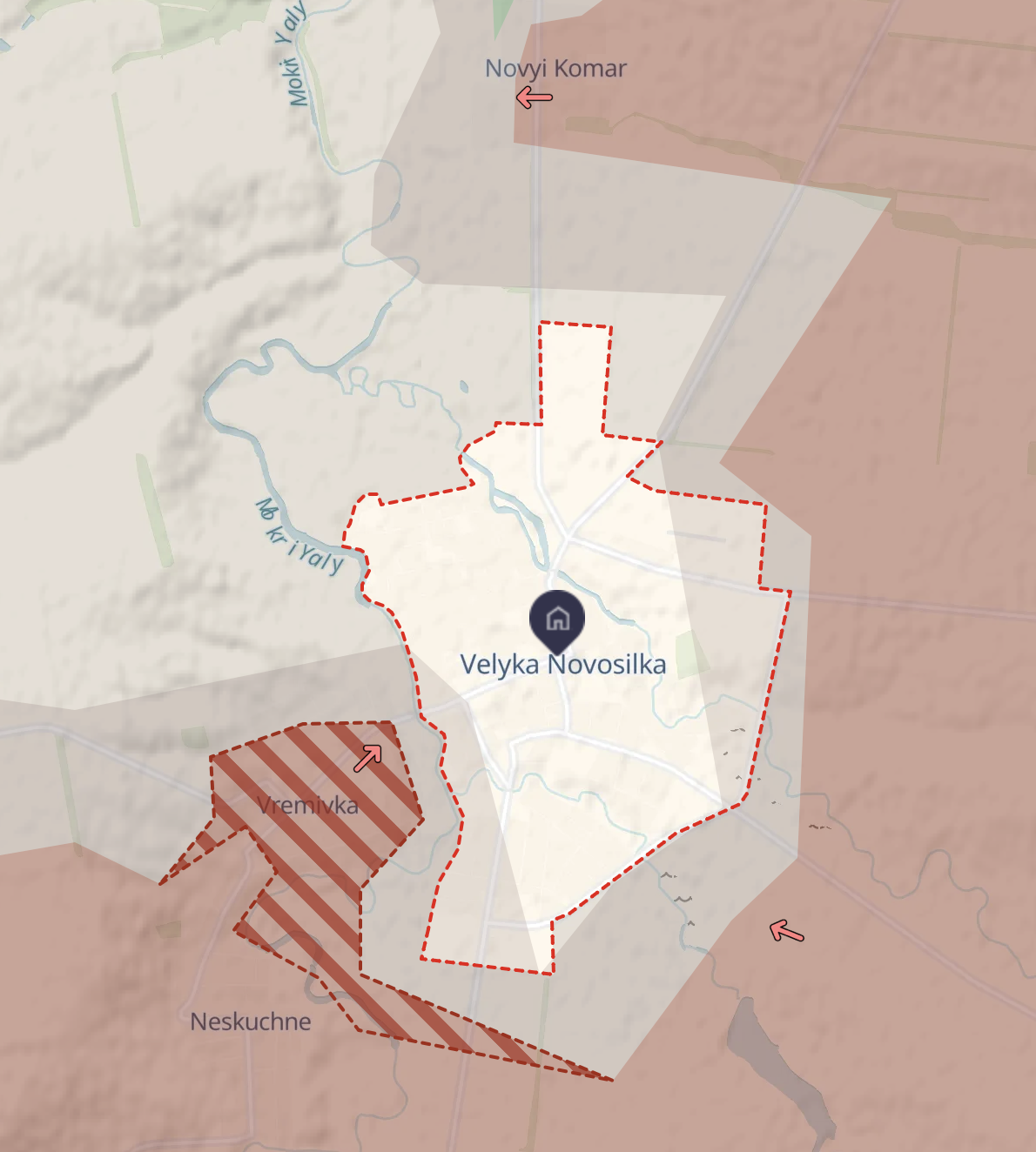 Учора ввечері український боєць із позивним "Мучною" повідомляв, що росіяни "стрімко" наступають у Врем'євці, маючи поступ з півдня на північ. Якщо село буде захоплене, "це буде ой як боляче нашому гарнізону у Великій Новосілку", додає військовий.