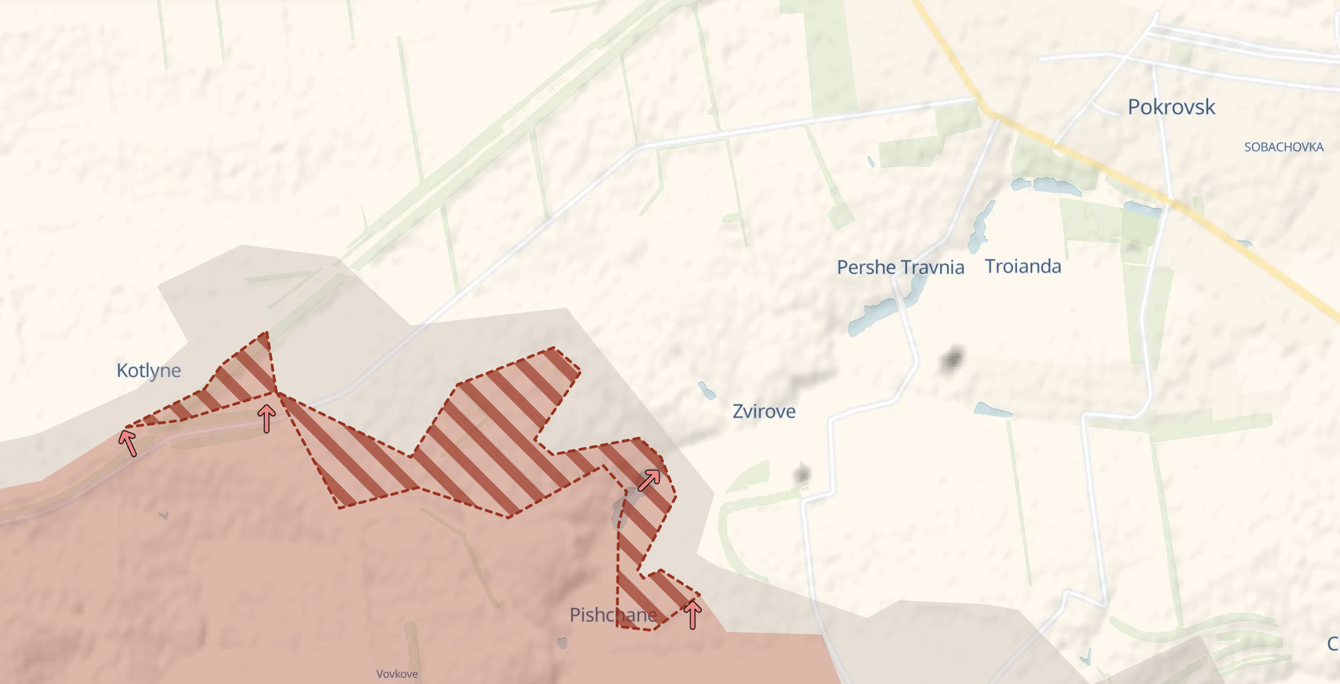 Росіяни також просунулися на південний захід від Покровська, захопивши Піщане та намітивши вектор руху до західних околиць міста.