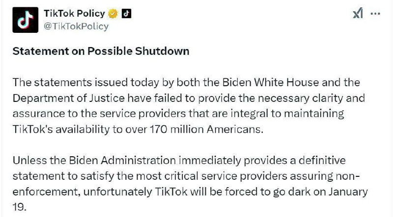 "Опубліковані сьогодні заяви Білого дому та міністерства юстиції не були достатньо ясними і не містили гарантій для постачальників послуг, чия робота необхідна для того, щоб ТікТок залишався доступним для більш ніж 170 млн американців. Якщо адміністрація Байдена не виступить негайно з чіткою заявою, яку влаштує основних постачальників послуг та гарантує невиконання закону, ТікТок буде змушений припинити роботу 19 січня", – заявляє компанія.
