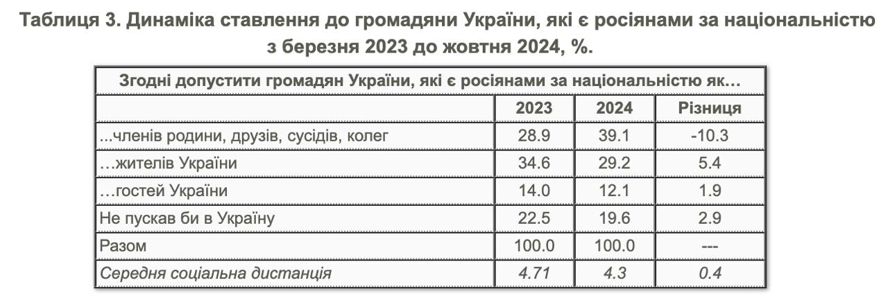 А ось до росіян за національністю громадян України ставлення гірше. Готові допустити їх у своє оточення 39%, а 29% погоджуються із твердженням, що вони мають жити в Україні (всього 68%). Нетерпиме ставлення до них має 32% опитаних. При цьому нетерпимих за півтора року поменшало на 10%. 2023 року 22,5% опитаних жителів України заявили, що росіян не слід було б пускати в країну, 2024-го - 19,6%.