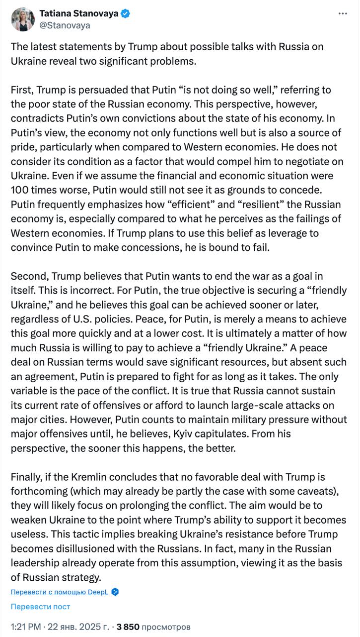"Якщо Кремль дійде висновку, що вигідної угоди з Трампом не передбачається (що, можливо, вже частково так і є - з деякими застереженнями), він, швидше за все, зосередиться на затягуванні конфлікту. Метою буде ослаблення України настільки, коли здатність Трампа її підтримувати стане марною. розчарується в росіянах. Фактично багато хто в російському керівництві вже діє з цього припущення, розглядаючи його як основу російської стратегії", - вважає Станова.