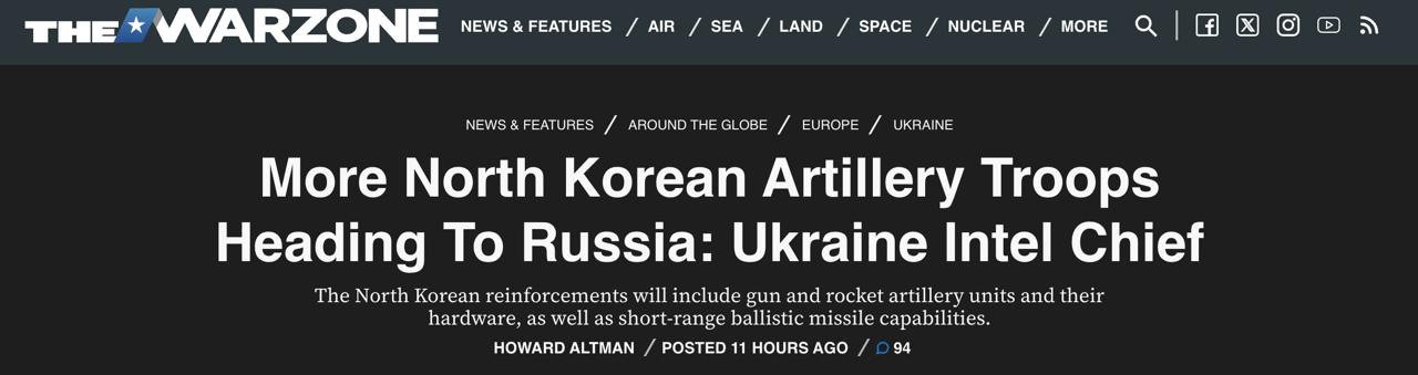 10:41 Північна Корея відправить РФ підкріплення до Курської області - ракетних та артилерійських військ, повідомив The War Zone глава ГУР Буданов.