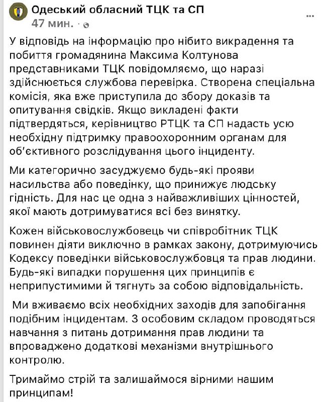 В Одеському обласному ТЦК заявили, що проводять службову перевірку. У справі створено комісію, а зараз проходить опитування свідків та збирання доказів.