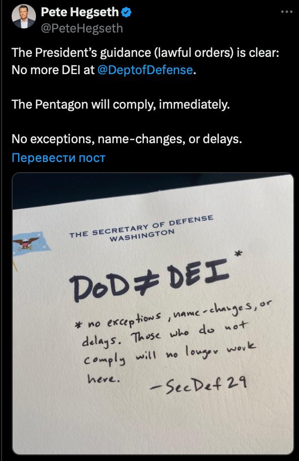 "Міністерство оборони не дорівнює DEI. Без винятків, зміни назв чи відстрочок. Ті, хто цього не виконує, більше тут не працюють", - написав Хегсет.