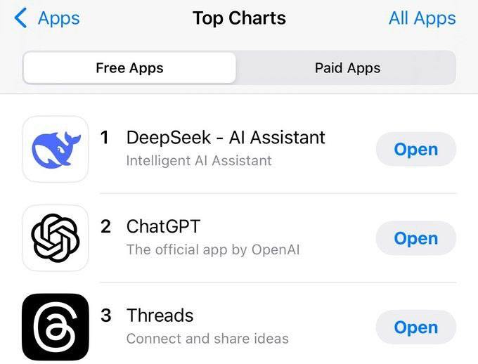 Китайська модель штучного інтелекту від стартапу DeepSeek вперше обійшла ChatGPT, ставши найрейтинговішим безкоштовним додатком, доступним в App Store. Модель також "викликала паніку по всій Кремнієвій долині".
