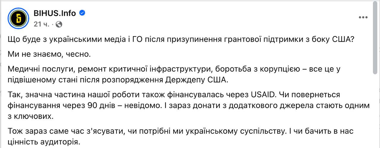 "Агентство (USAID) покривало значну частину і нашої діяльності. Тому зараз роль донатів від глядачів змінюється з альтернативного джерела на один із ключових. Що буде через 90 днів, нам невідомо, проте знаємо одне: зараз саме час з'ясувати, чи справді наша робота потрібна українському суспільству", - зазначили у редакції Bihus.Info.
