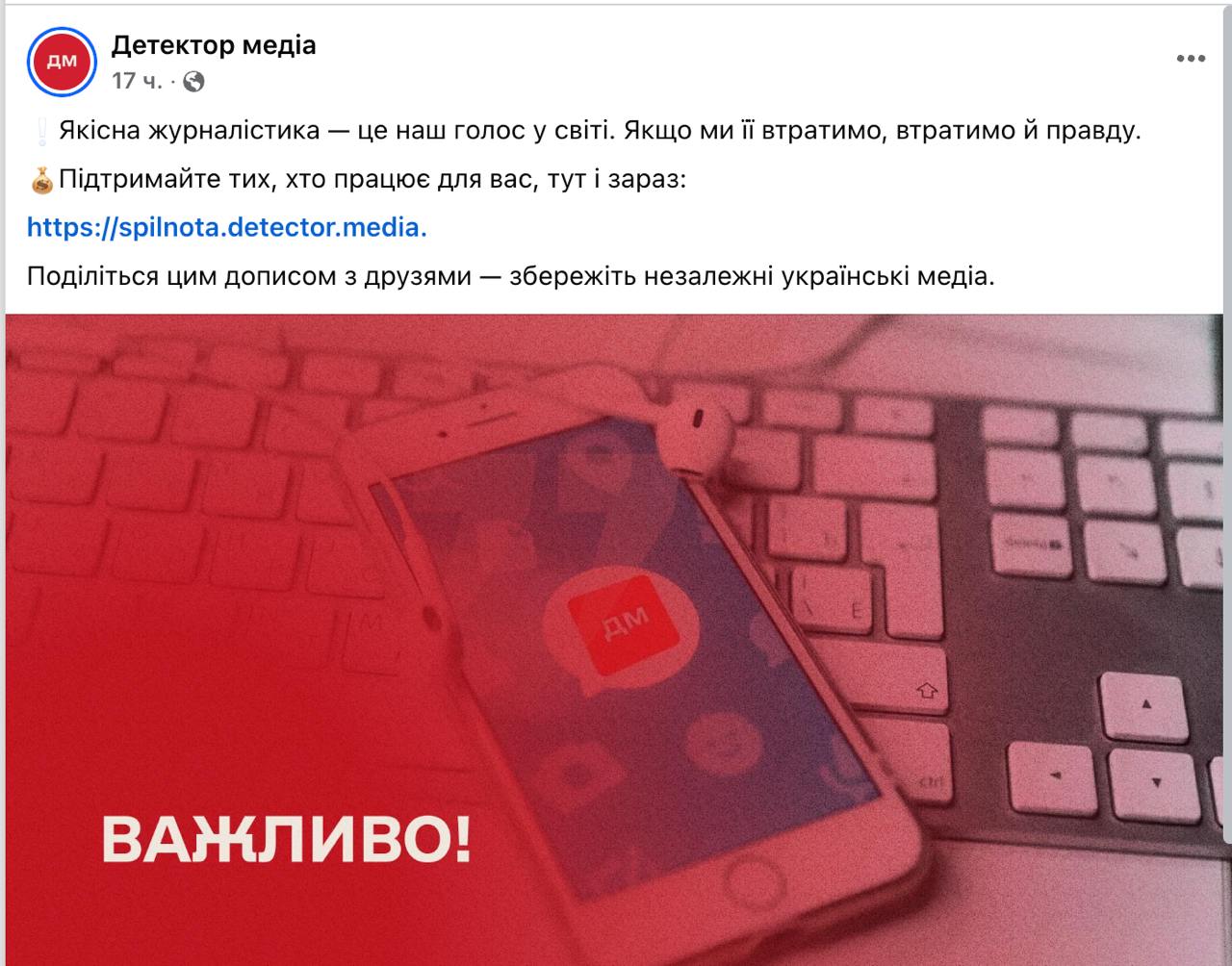 "Якісна журналістика - це наш голос у світі. Якщо ми його втратимо, втратимо і правду. Підтримайте тих, хто працює для вас, тут і зараз", - попросив учора на своїй Фейсбук-сторінці проект "Детектор медіа", який більшу частину своїх коштів офіційно одержує від джерел, що фінансуються USAID.