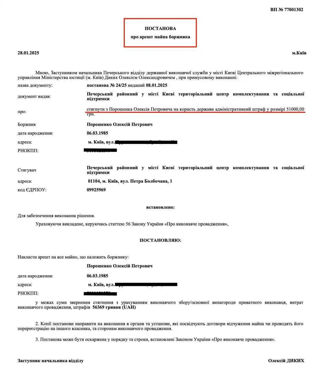 У старшого сина колишнього президента України Петра Порошенка, 39-річного Олексія, заарештували майно через несплату штрафу у розмірі 56 тисяч гривень, призначеного за ухилення від служби.