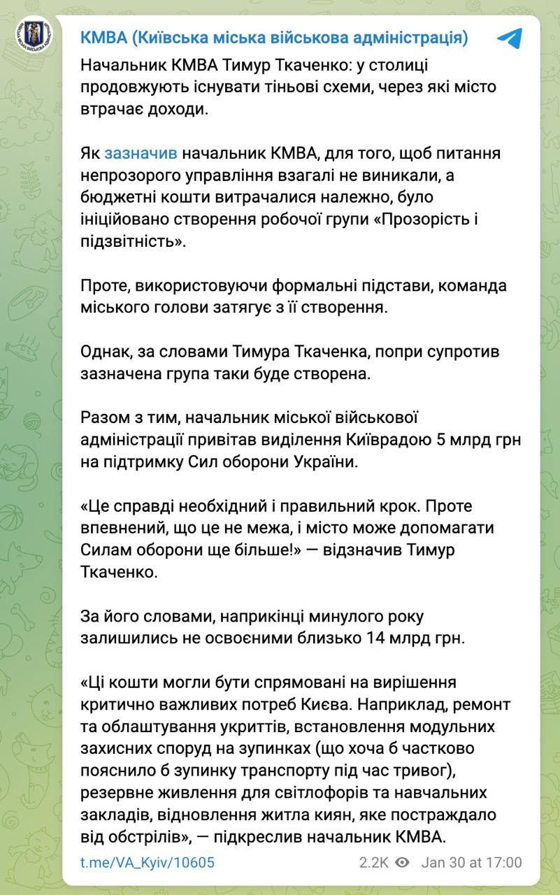 За його словами, наприкінці минулого року залишилось не освоєно близько 14 мільярдів гривень. Ці кошти могли бути спрямовані на вирішення критично важливих потреб Києва: ремонт та облаштування укриттів, встановлення модульних захисних споруд на зупинках, резервне харчування для світлофорів та навчальних закладів, відновлення потерпілого від обстрілу житла киян.
