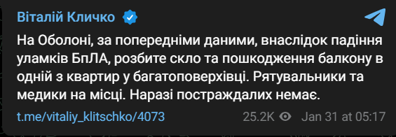 08:10 У Києві на Оболоні, за попередніми даними, внаслідок падіння уламків БпЛА, розбито скло та пошкоджено балкон в одній із квартир у багатоповерхівці, повідомив мер столиці Віталій Кличко.