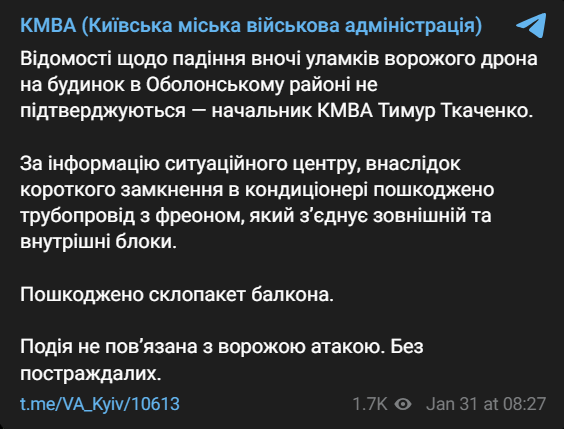08:30 Інформація про падіння уламків дрону додому у Києві не підтвердилася, повідомляє КГВА.
