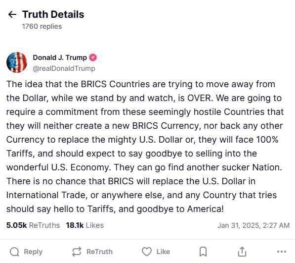 "Ідея про те, що країни БРІКС намагаються відмовитися від долара, поки ми просто спостерігаємо, закінчена. Ми вимагатимемо від цих, ймовірно, ворожих країн зобов'язань не створювати нову валюту БРІКС і не підтримувати жодної іншої валюти, яка могла б замінити могутній долар США В іншому випадку на них чекають 100% тарифи, і вони можуть попрощатися з можливістю продавати свої товари в чудову економіку США. Нехай знайдуть іншу країну-лоха. Країна, яка спробує це зробити, має готуватися до тарифів та прощатися з Америкою!" – написав президент США..jpeg)