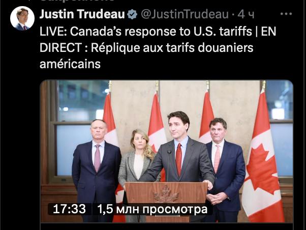 Канада вводить 25% тарифи для товарів на загальну суму 106 млрд доларів США, заявив прем'єр-міністр Джастін Трюдо. Він також закликав співвітчизників купувати канадські товари та проводити відпустку на батьківщині, а не у США.