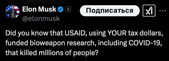 "Чи знаєте ви, що USAID, використовуючи ВАШІ податкові гроші, фінансувало дослідження біологічної зброї, включаючи COVID-19, внаслідок яких загинули мільйони людей?" - Написав Маск.