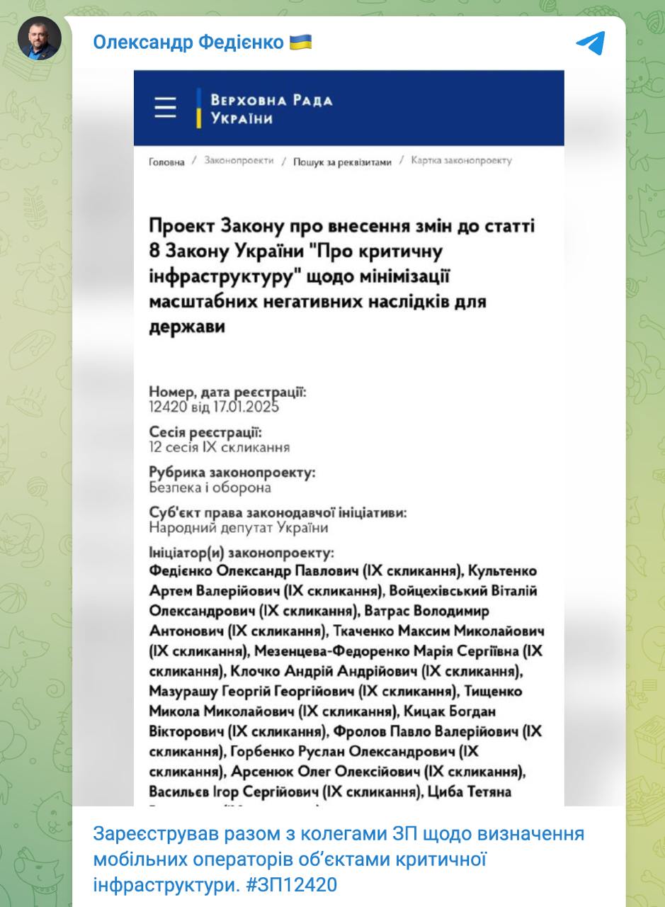 "Це обумовлено необхідністю здійснення забезпечення безперебійним мобільним зв'язком населення та державних органів України", - пише нардеп.