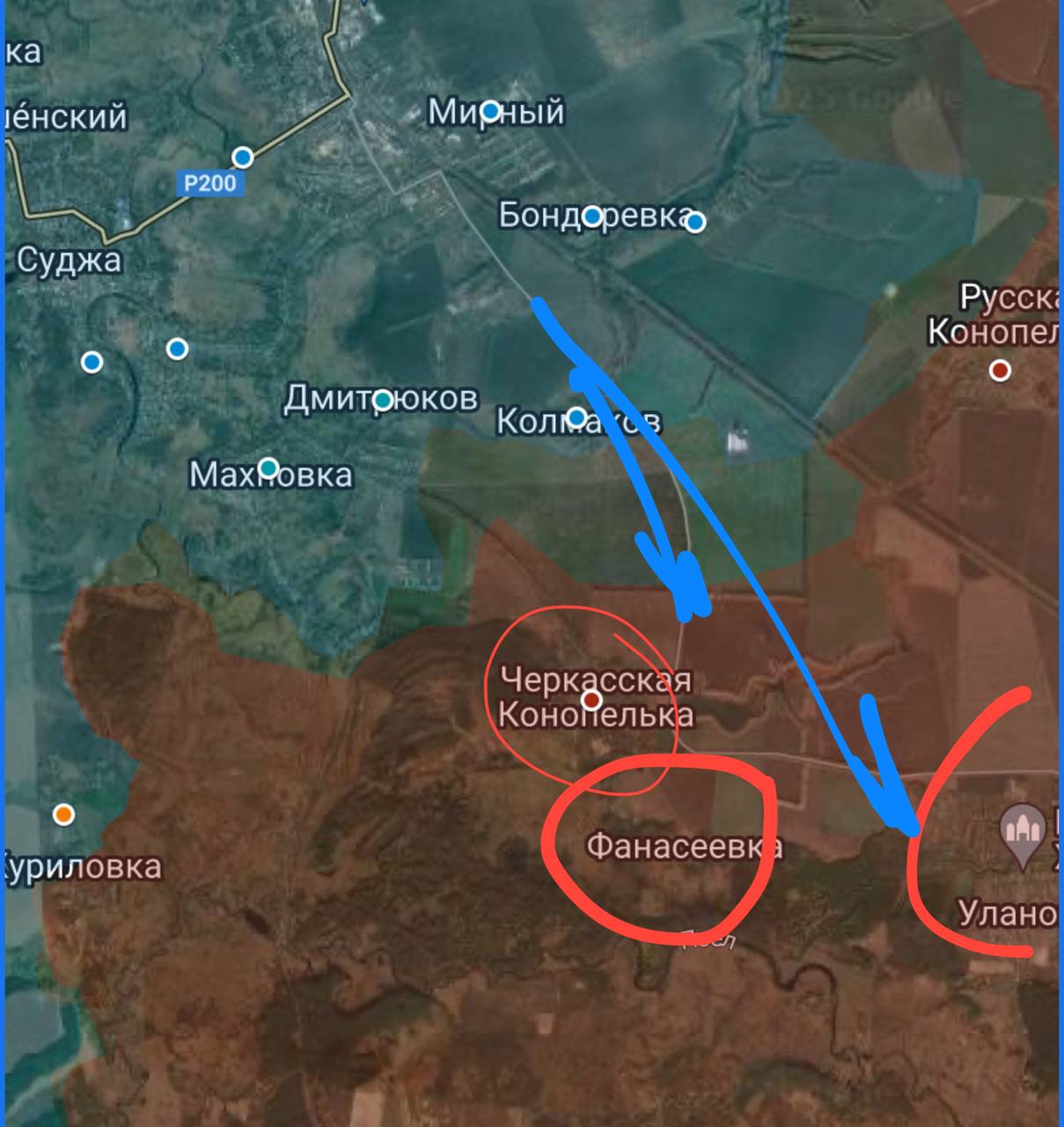 Z-канали вважають, що мета удару - зайняти назад нещодавно втрачену Черкаську Конопельку і вийти в тил військам РФ, що настає в районі Гуєво. І заразом убезпечити трасу постачання із Сум.