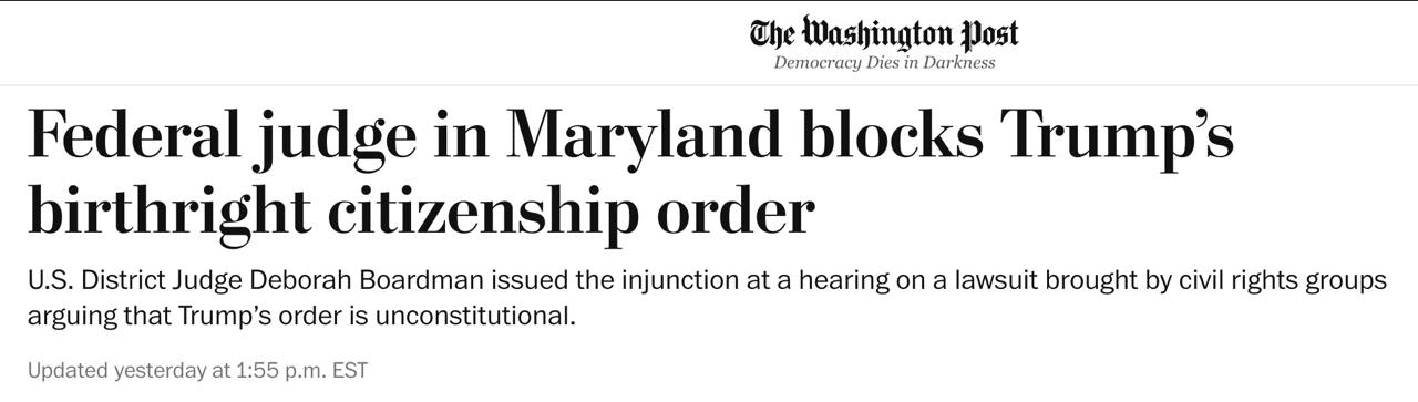 Федеральний суддя в Меріленді заблокував на невизначений термін указ президента США Дональда Трампа про відміну громадянства з права народження.