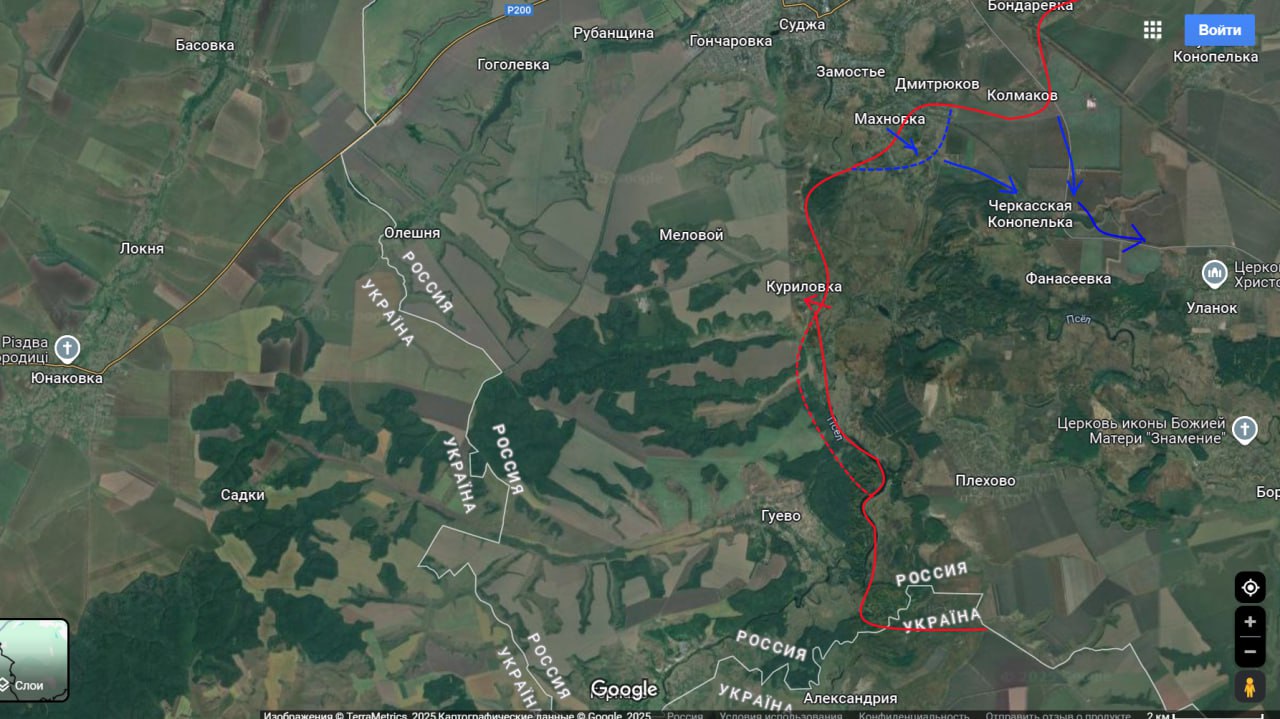 Російські військові телеграм-канали повідомляють про атаку ЗСУ у напрямку сіл Черкаська Конопелька (деякі російські паблики говорять про заняття підрозділами ЗСУ частини цього села, інші пишуть, що українські сили висадили десант поблизу нього і там зараз точаться бої, а в самому селі їх немає).