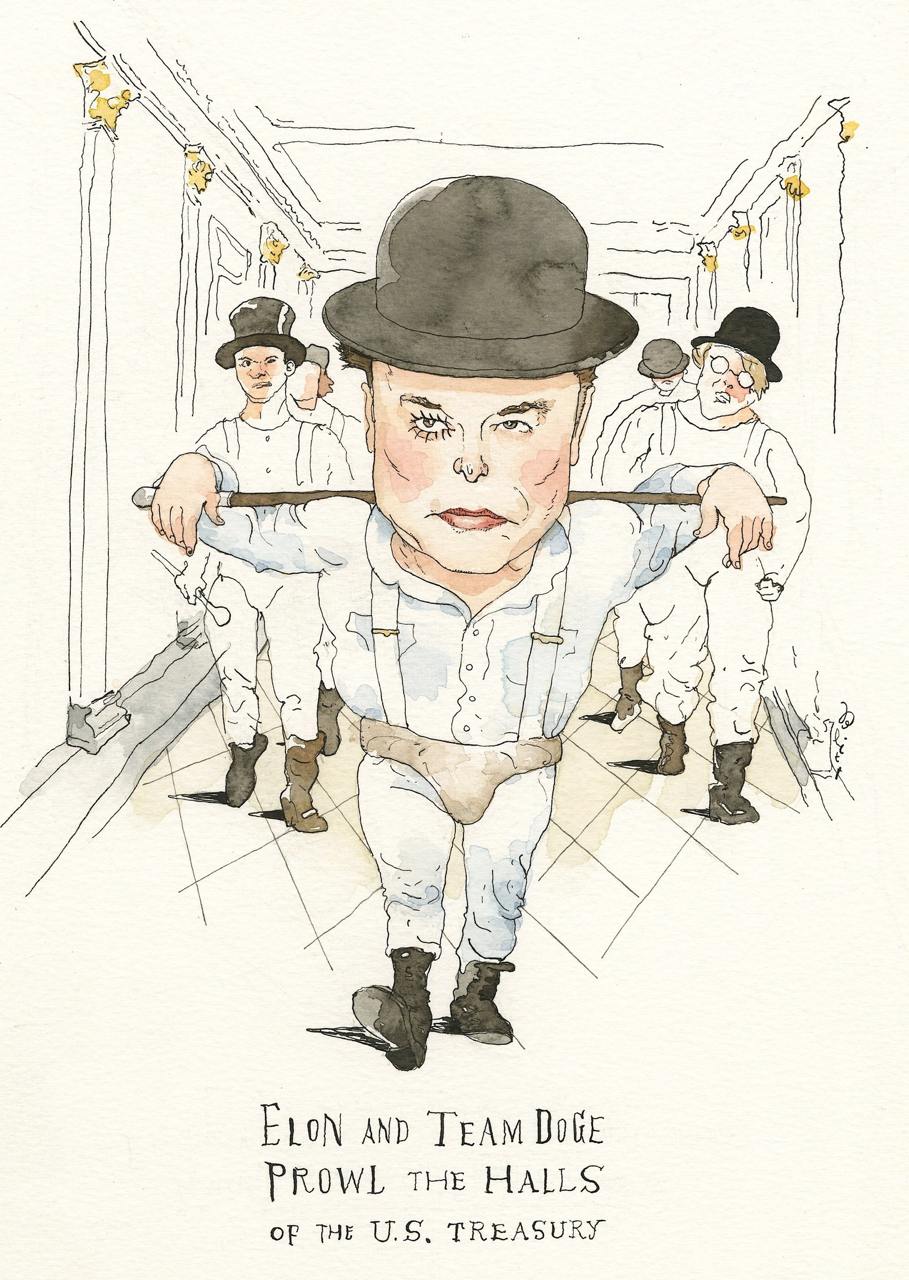 Також Маск став героєм карикатури в журналі The New Yorker, де його із командою DOGE зобразили в образі персонажів фільму Стенлі Кубрика "Заводний апельсин".