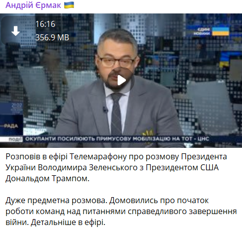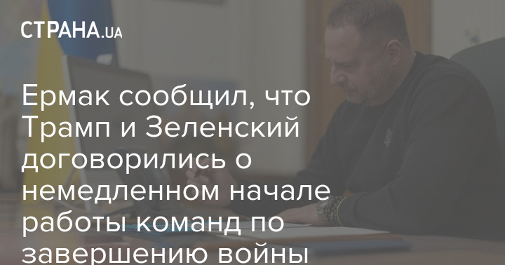 Єрмак повідомив, що Трамп та Зеленський домовилися про негайний початок роботи команд після завершення війни.