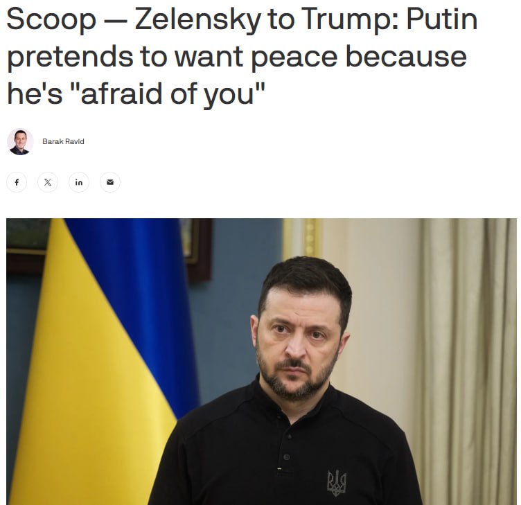 Трамп повідомив Зеленському, що Путін бажає укласти угоду, і запитав, чи Зеленський, як і раніше, налаштований на її укладання. Президент України відповів, що він, як і раніше, хоче укласти угоду, але "Путін сказав вам, що він хоче укласти угоду тільки тому, що боїться вас, тому що ви сильні".